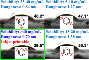 Inkjet printing OLED layers represents a promising solution to these challenges, while also eliminating the equipment cost and scaling issues associated with VTE at large substrate sizes. However, many traditional materials require process optimization to achieve sufficient solubility in the solvents used for printing. Wei et al sought to solve this problem by modifying the pyridine-linkage orientation in their material design, dramatically improving solubility in dichloroethane while maintaining similar optoelectronic properties in a model top-emission device. Their study showed that a 2,6-pyridine core not only increases solubility by up to 8x but it also provides a much higher surface energy (~40 mN/m), improving subsequent ink-jet printing steps in non-aqueous media. This main chain positioning is just one way of modulating solubility, but side-chain moiety modification is another avenue that can be explored in the case of known target solvent systems to further improve solvent compatibility.