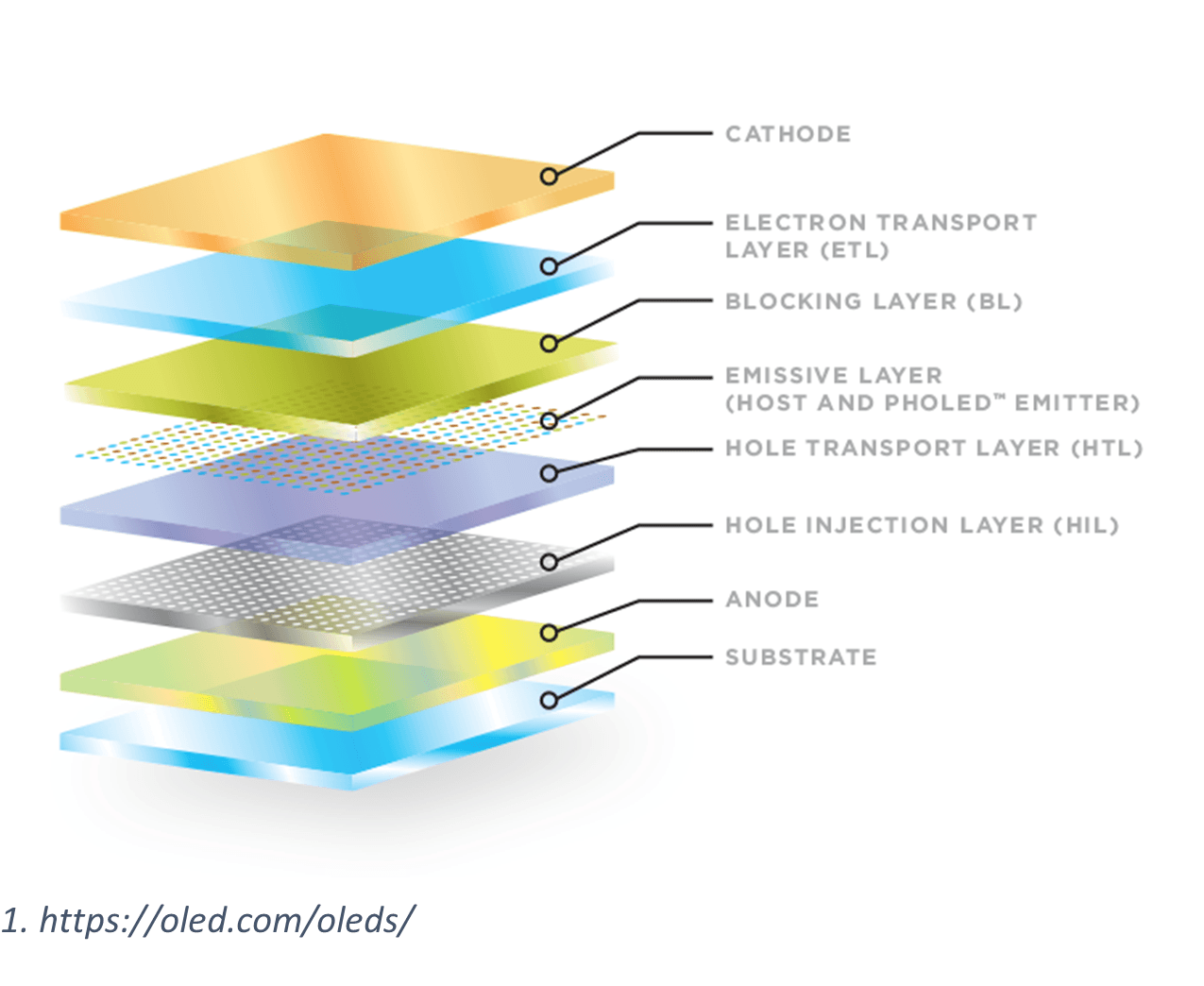 Simplified example of OLED internal layer structure. Courtesy of OLED.com/OLEDs